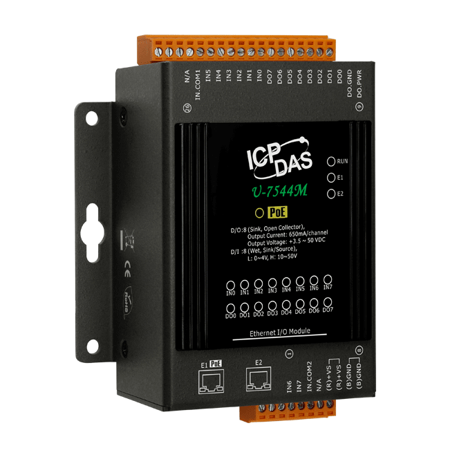 Модуль с 8 каналами дискретного ввода (Мокрый контакт, 10~50 В пост.) и 8 каналами дискретного вывода (Sink, 3.5~50 В пост.), со встроенным 2-портовым Ethernet-коммутатором, протокол OPC UA
