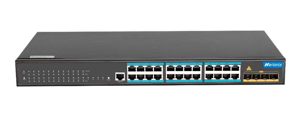 Управляемый промышленный Full Gigabit Ethernet коммутатор 3 уровня, 24 x 1G RJ45 PoE, 4 x 10G SFP+, общий PoE бюджет 370W, питание 100~240VAC, монтаж в стойку 19″
