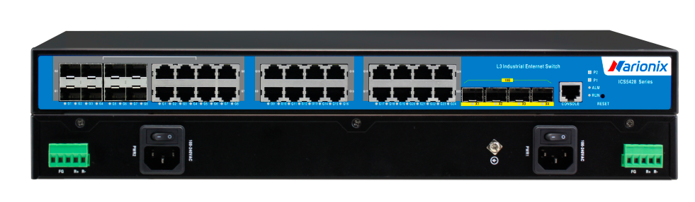 Управляемый промышленный Full Gigabit Ethernet коммутатор 3 уровня, 16 x 1G RJ45, 8 x 1G Combo, 4 x 10G SFP+, питание 2 x 18~72VDC, монтаж в стойку 19″