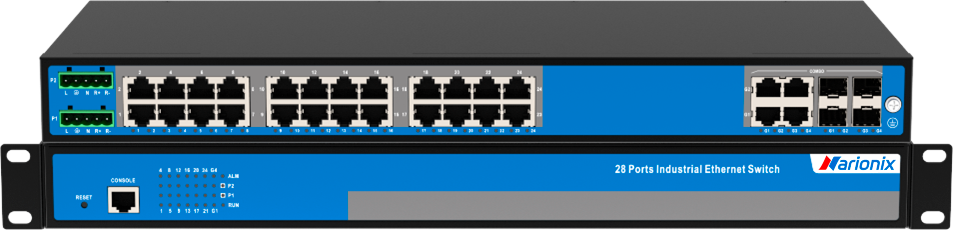 Управляемый промышленный Gigabit Ethernet коммутатор 2 уровня, 22 x 100M RJ45, 2 x 100M оптика, 4 x 1G Combo, питание 2 x 85~264VAC/DC, монтаж в стойку 19″