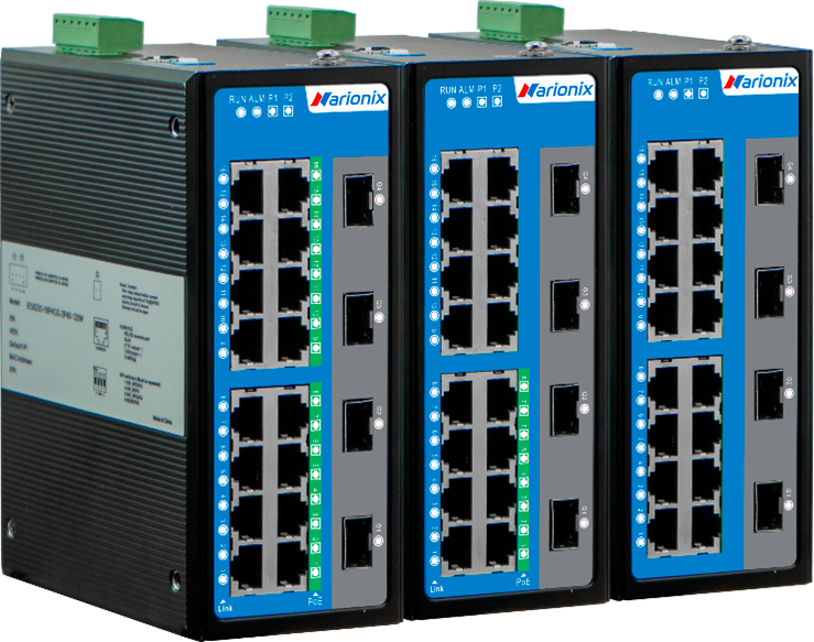 Неуправляемый промышленный Gigabit Ethernet коммутатор, 16 x 100M RJ45 PoE, 4 x 1G SFP, общий PoE бюджет 120W, питание 2 x 48VDC, монтаж на DIN-рейку