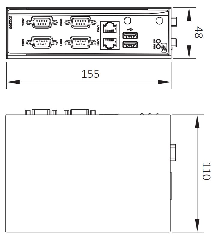Встраиваемый безвентиляторный компьютер на DIN-рейку ICO300-E3827-DIO-PB-DC с процессором Intel Atom E3827 (1.75 ГГц), 4 x RS-232/422/485, 2 x 10/100/1000 Ethernet, 1 отсек SATA 2.5", VGA, 1 x SIM, 2 x USB, DIO, напряжение питания 12-24 В DC, с кнопкой питания
