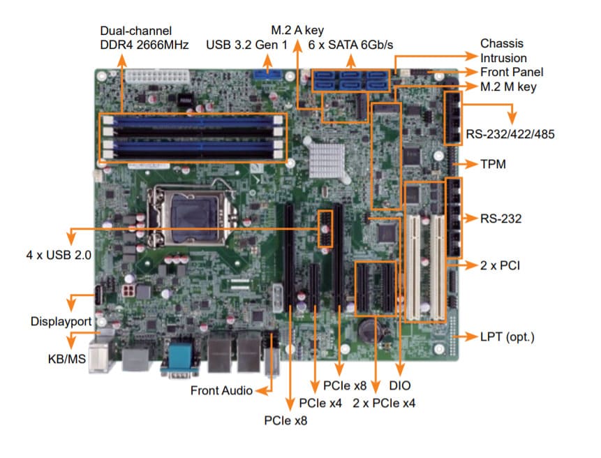 Промышленная материнская плата IMBA-Q370, ATX, LGA 1151, процессор Intel® Core™ i9/i7/i5/i3, Pentium® или Celeron®, DDR4-2666 МГц, до 64 Гб, 6 x SATA 6G/s с поддержкой RAID 0/1/5/10, 1 х VGA, 1 х DP++, 1 х HDMI, 1 х DP(внутренний), 2 x GbE LAN, 4 x RS-232, 2 x RS-232/422/485, 6 x USB 2.0, 6 x USB 3.2, 1 x I²C, 1 x SMBus, GPIO, 3 x Audio, 1 x Analog audio, 1 x PS/2, 2 x PCI, 3 x PCIe x4, 2 x PCIe x8, 1 x M.2 A key (2230, PCIe x1/USB 2.0), 1 x M.2 M Key (2280, PCIe x2), -20....+60°C