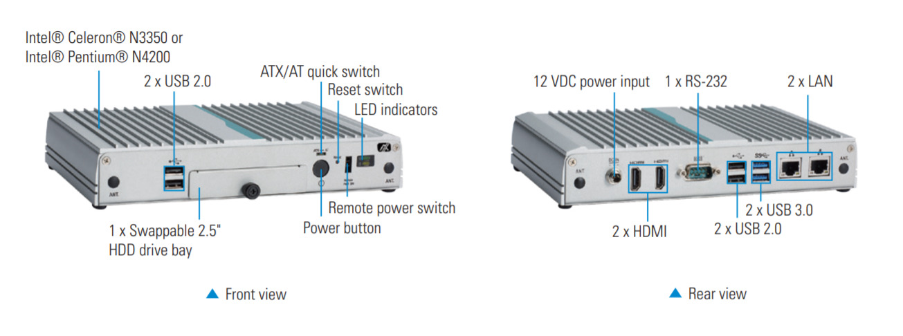 СкачатьВстраиваемый безвентиляторный промышленный компьютер с процессором Intel® Celeron® N3350 2.4 Ггц / Pentium® N4200 2.5 Ггц для розничной смарт-торговли и предприятий лёгкой промышленности.